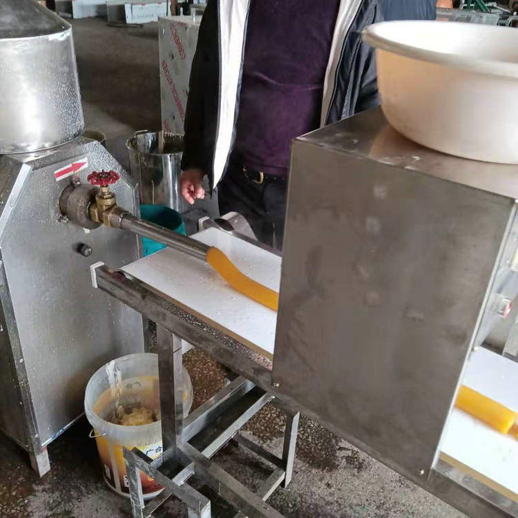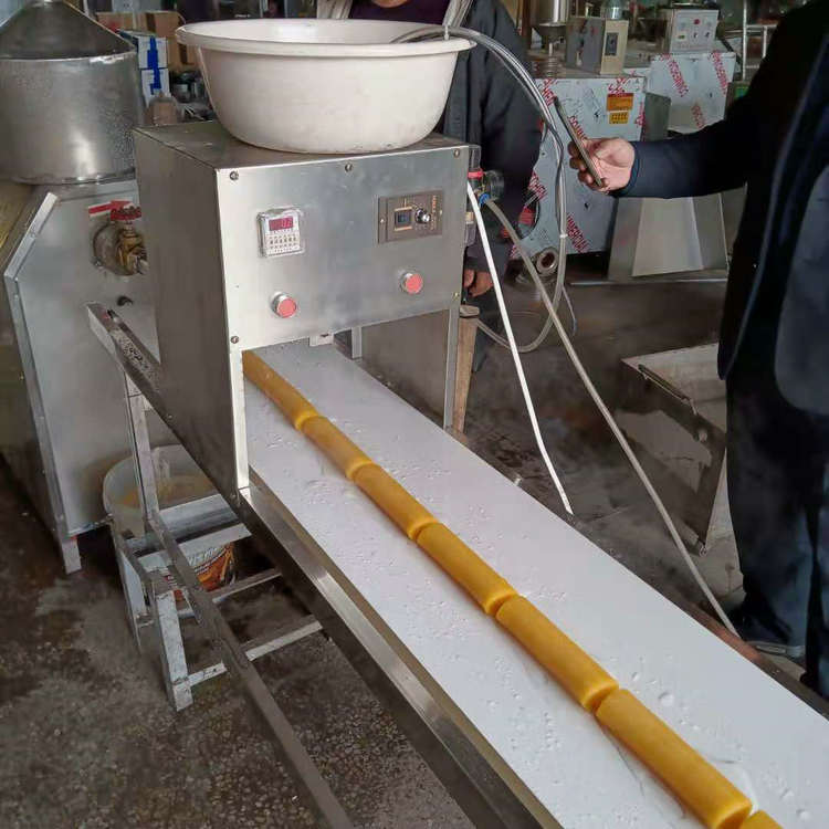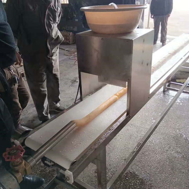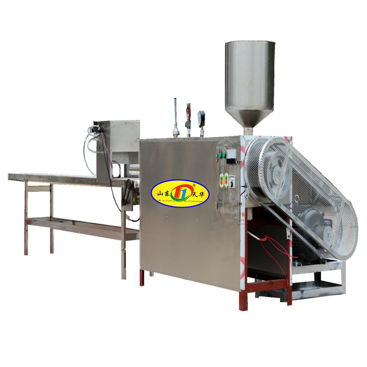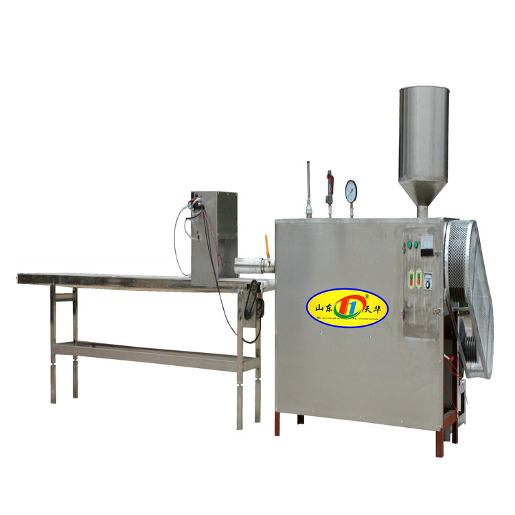玉米粑粑機由電熱溫控裝置、水浴蒸箱、螺桿揉壓勻質擠出裝置、成型模頭和數控切斷機組成,螺桿揉壓勻質擠出裝置外面由水浴蒸箱包圍,蒸箱內注有水,通過電熱溫控把水燒開,蒸煮通過螺桿的玉米漿,使之熟化,并推揉勻質,經模具定型擠出而成。其配套的切斷機可以通過延時控制器調整切斷的長短。該機也可以用米漿加工年糕、米豆腐、堿粑等,還可以用木薯淀粉和玉米淀粉加工蝦片等。