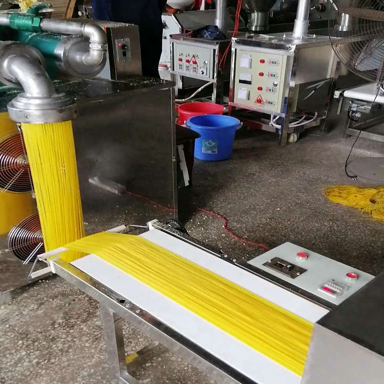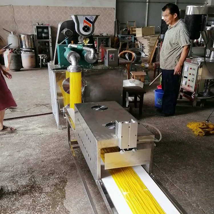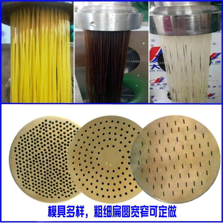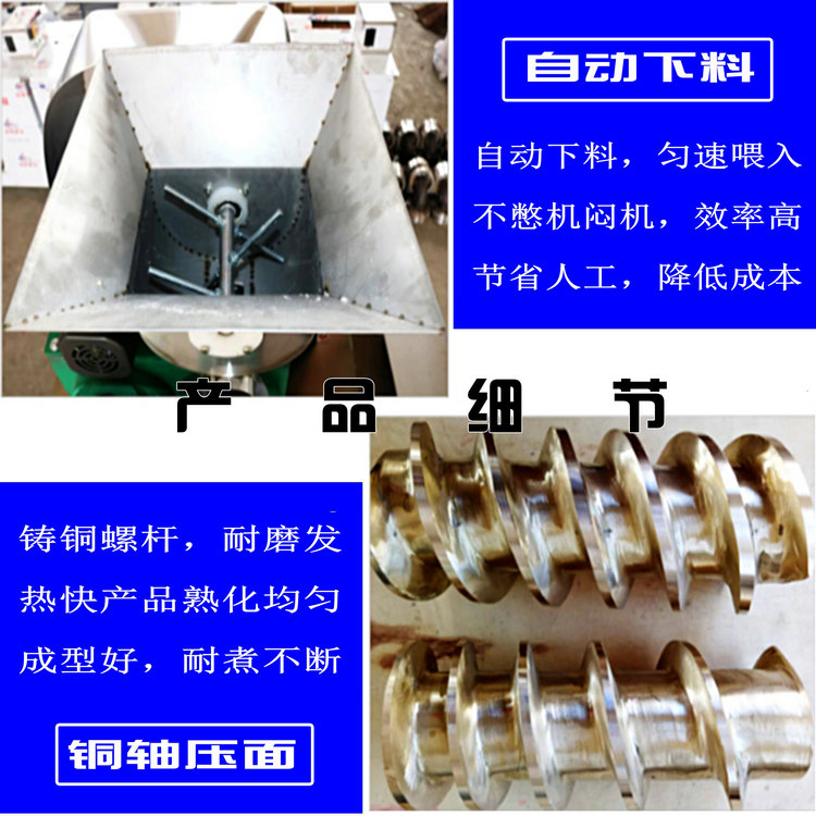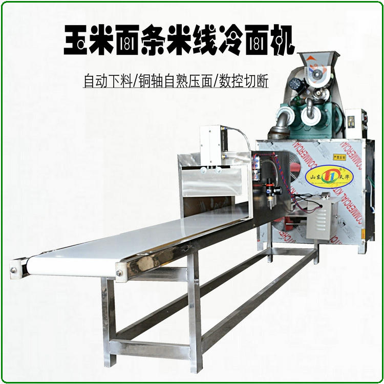 天華自熟冷面機(牛筋面機)結(jié)構(gòu)合理,造型美觀,由自動下料器、雙銅軸壓面機、數(shù)控切斷機組成,自動下料器由調(diào)速電機帶動,通過快慢速度調(diào)整喂料的多少,壓面機采用螺旋擠壓生物變性工藝,無需外加熱源,利用軸筒旋轉(zhuǎn)與原料摩擦揉擠產(chǎn)生的熱能,使原料到成品一次熟化成型,將玉米面、蕎麥面、小麥面等雜糧面通過冷面機綜合轉(zhuǎn)化成具有柔韌彈性特點的風(fēng)味面食,更換不同的的模具可以加工不同粗細寬窄的形狀,產(chǎn)品外表光滑、柔軟可口、久煮不糊,保留原糧的特有營養(yǎng)成分和微量元素。自熟冷面機還可生產(chǎn)鋼絲面、牛筋面及各種雜糧面條等。成型的面食進入調(diào)速皮帶輸送機,由延時控制切斷裝置把面條切成所需的長短后即可包裝銷售。